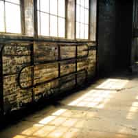 View gallery with title: Wychwood TTC Car Barns - Interior photos of streetcar maintenance sheds, lit by skylights above. Includes industrial details and equipment.