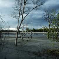 In the case of our visit, we encountered tailing ponds that covered 25 km2 (10 mi2) in the town of Lively, just west of Sudbury. Over time, the tailing ponds are slowly filled. In some cases you can see how much has been filled in by spotting partially buried trees. The effect is bizarre, beautiful and sad at the same time.