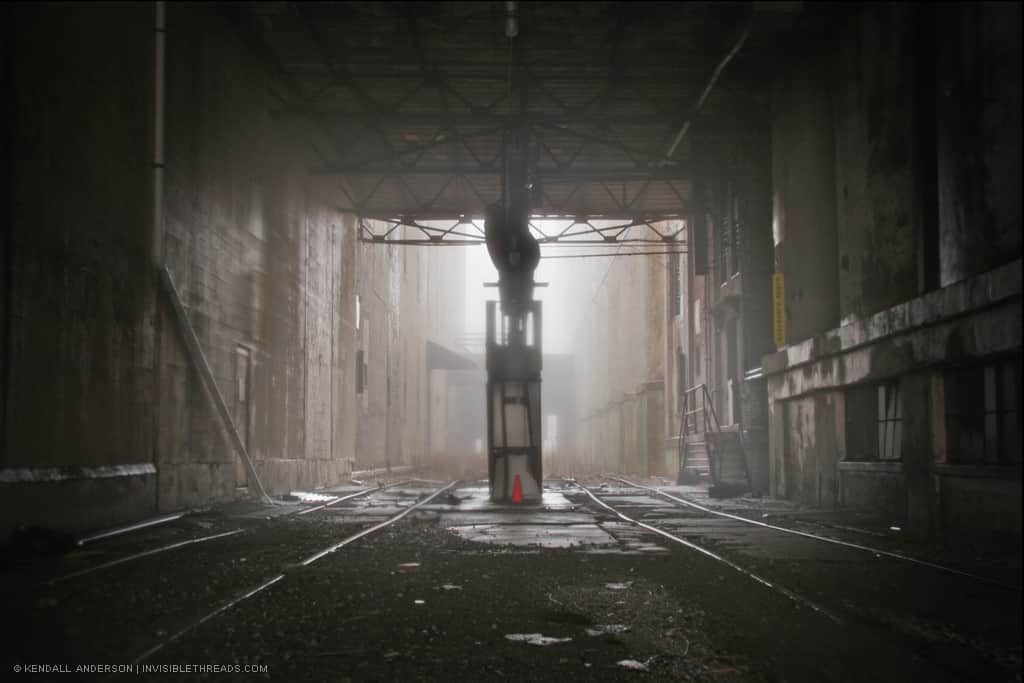 Between two of the American grain elevators ran two rail tracks. With the fog still in full effect, the otherwise plain one-point perspective took on a somewhat more mysterious character.