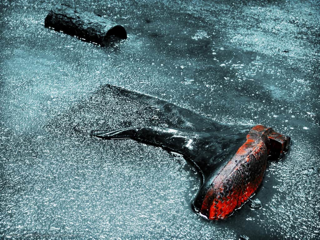 One of the locations we explored in Hamilton had been partially flooded and then of course, frozen. Chairs, pipes, wheels, containers and — this boot — were frozen in the ice.