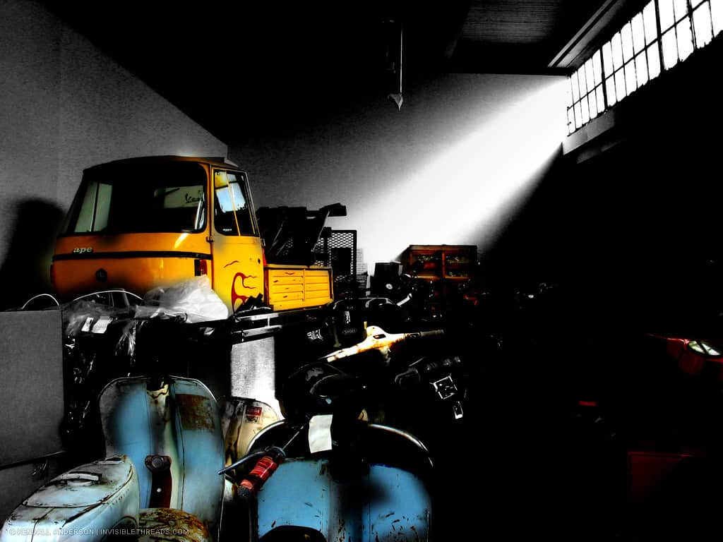 I alternately like (mildly) and hate (strongly) this one. The light from the skylight is far too extreme and I just don't think the contrast of the background works with that of the foreground. On the other hand, I like the amount of detail and light given to the blue vespas in the front, and the orange/yellow truck.