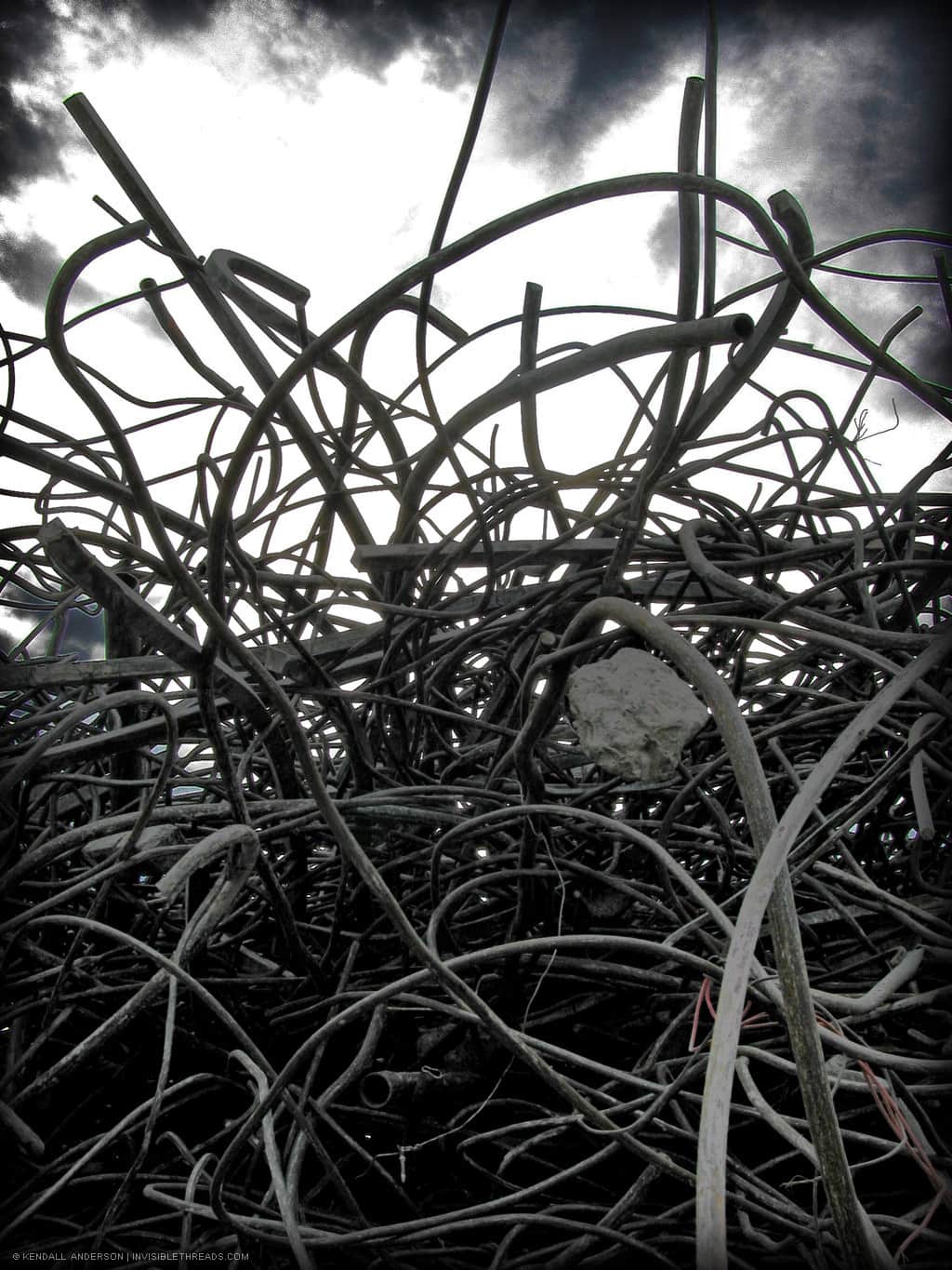 This was part of the assorted mess from the partial demolition of the Loblaws Food Bank building back in July 2004. This tangled web of rebar seemed a little menacing but also like a sculpture. The pipes from yesterday's photo were just on the opposite side of this.