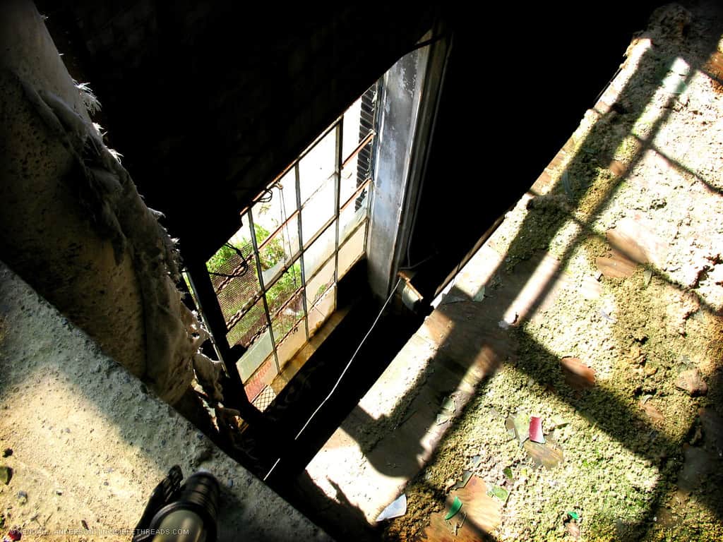 At this point I am at the edge of the concrete beam on the west wall, looking down past the attic floor to the ground level (my tripod foot is the shiny thing in the lower-left). Moss is growing on the floor and the water damage is slowly eroding the floor. If it keeps up like this it will eventually collapse under its own weight.