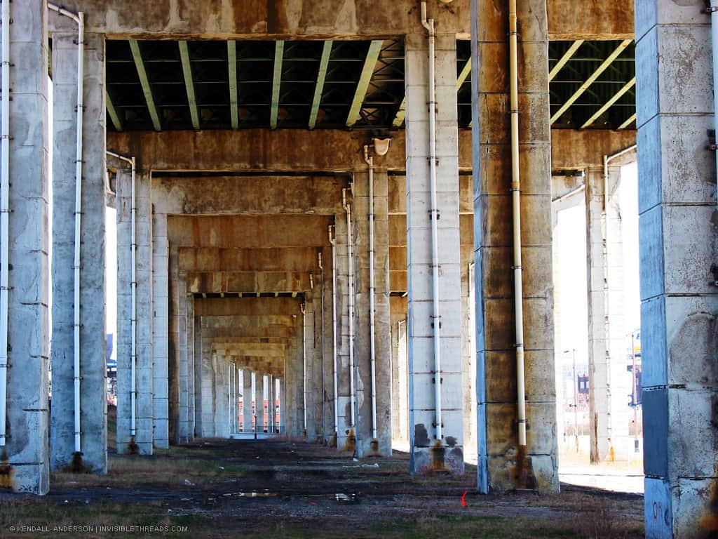Granted it's a rusting eyesore which most people want to remove, but it's a very different experience walking underneath this rather than driving. I was very happy to find this space today..