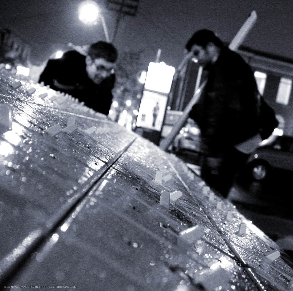 Davin and Rannie examine the controls to the lightbulb sign outside the Drake Hotel last night after the impromptu Toronto Photoblogger get-together. It was a wonderful environment for my camera — I succeeded in capturing almost 30 entirely blurred and dark images inside the bar.