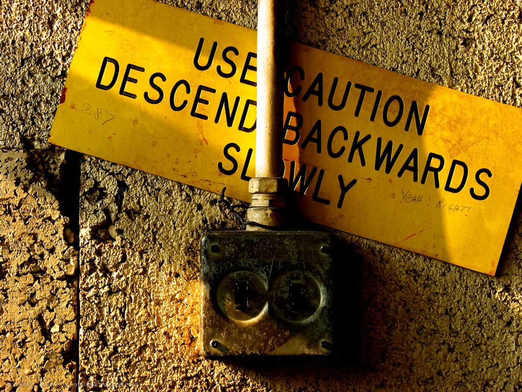 This was taken at the abandoned WSIB complex (same place as this photo) just over a month ago. This safety sign was at the top of the stairs down from the mechanical room. In all fairness, they were *very steep*, but still... this recommendation might be a little too cautious.