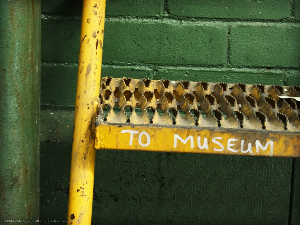 A label indicating the future resting place for this ladder, or a hidden museum behind the green brick wall. Taken at the Wychwood TTC Car Barns.