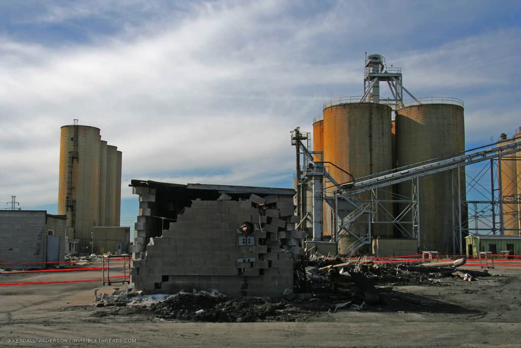 Another view of the bleak landscape, but in nicer light. The small concrete building in the foreground just kills me — somebody's made it clear that they're going to demolish it but they never followed through. This tiny structure is left quivering, fighting for stability.
