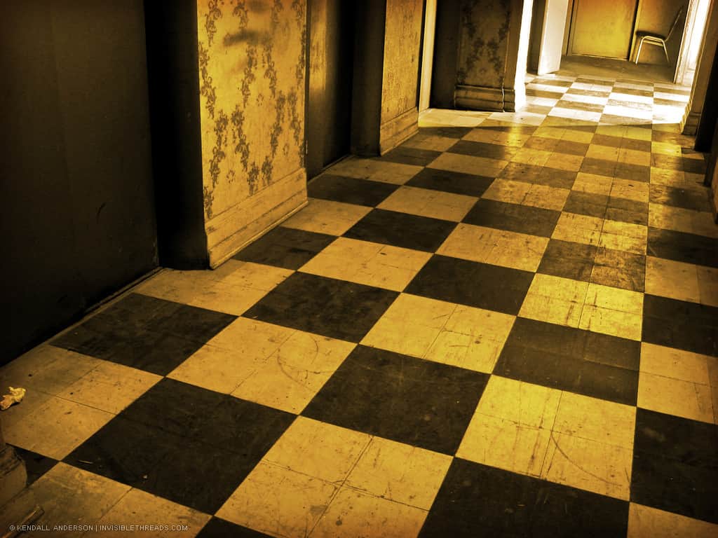 The elevators no longer go to this floor so there's no reason to keep it clean. Since the 1950s this area has been unused. That may explain the floor tile but the wallpaper (oh so flowery!) looks like it may date back a few decades more.