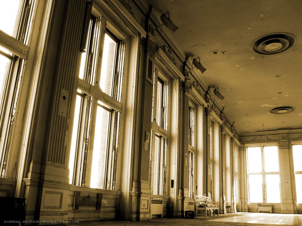 This is the full view of the ballroom with the large double-height windows. At this point the windows face south and east and provide a great view of the city and Lake Ontario. When this addition to the hotel was constructed, it was one of the largest buildings in the city.