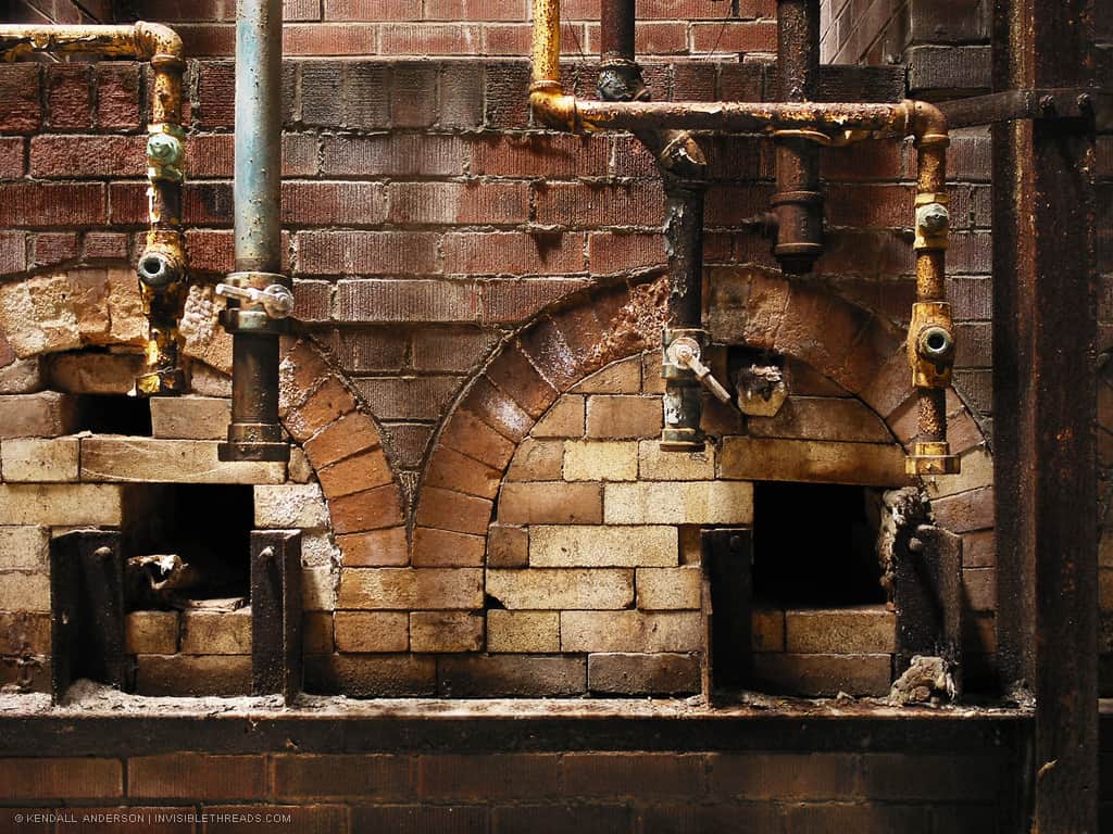 Many of the windows into the ovens were bricked over for some reason. All along the exterior walls were hung these multi-coloured pipes with various nozzles and attachments.