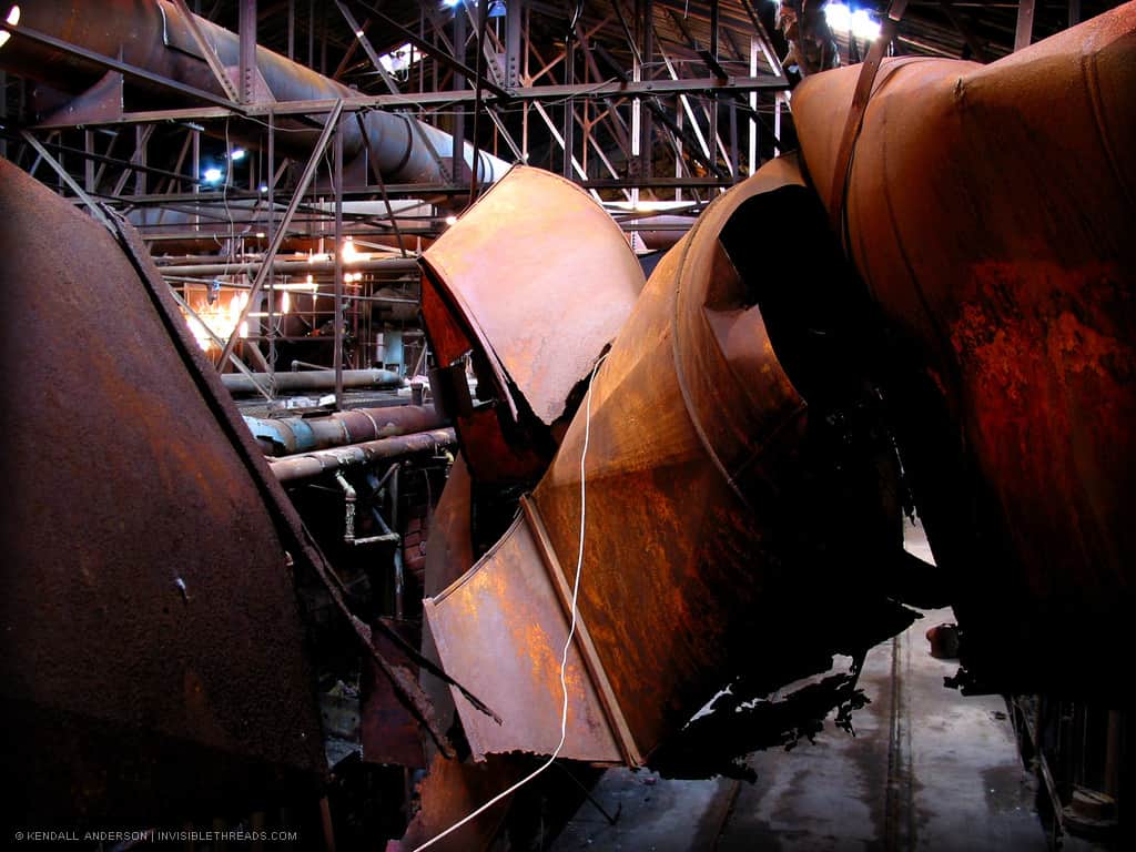 One particular piece of ductwork had seen better days. It is suspended between two brick ovens and is in the process of falling down into the corridor. It's not clear what is still holding it up (perhaps sheer will power).
