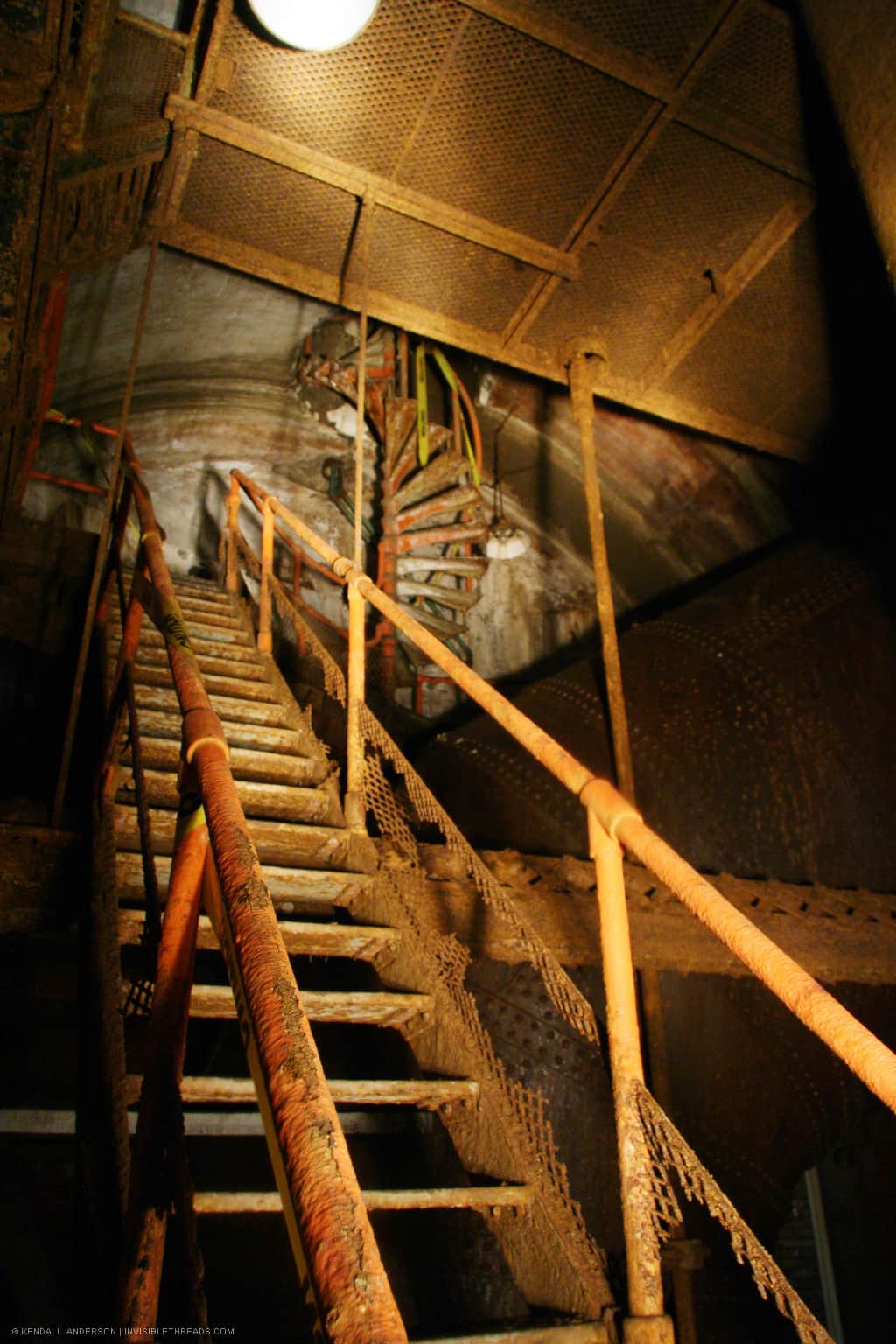 Below the station, the turbine shafts run deep — 150' or so — underground. We didn't make it that far (safety is a concern, no matter what it may look like) but we did get down maybe two-thirds of the way. Going further requires a greater level of committment and proper safety.